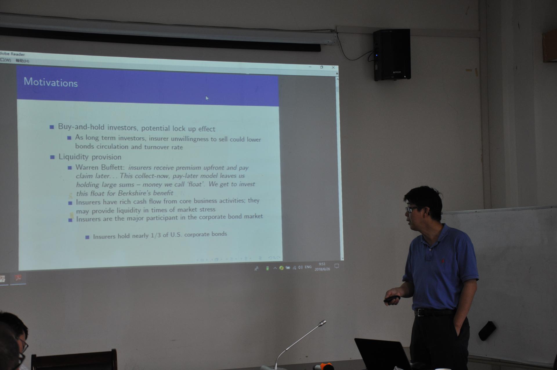 在本次专题讲座中,虞教授首先向大家介绍了本次交流的课题梗概,将本次的讲座内容分为了“研究背景与意义”、“理论基础与研究现状”、“研究的猜想”、“考虑了消费者、投机商、资本家的模型构建”、与“总结”几个部分,以几个与现实背景密切相关的问题打开话题,深入浅出地为大家讲述了他文章中模型构建的原理与其丰富的实践意义,风趣幽默,引人入胜。最后以其模型严密的逻辑,通过三种度量流动性不足的方法,给我们讲述了保险公司通过持有债券为困难时期的债券市场提供市场流动性的故事。