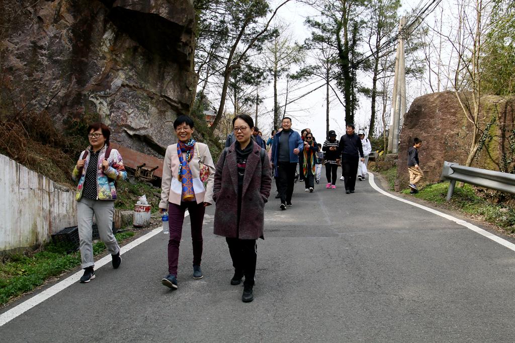 一路上,沿阶而下,看到了群峰斗妍,古树参天、竹木蔽日、溪水潺潺,在工作之余享受到了大自然的鬼斧神工、原始的山水风光、质朴的山乡风情。在大片的树林中,有一株千年白桃花树,一株古劲松树和五株古香榧树,这些古树躯干粗大,须数人合围,树根裸露,老斑重重,虽历经风霜雨雪,且仍郁郁葱葱,傲立苍穹。大家为老树坚强的生命力所折服,不住地发出赞叹声。