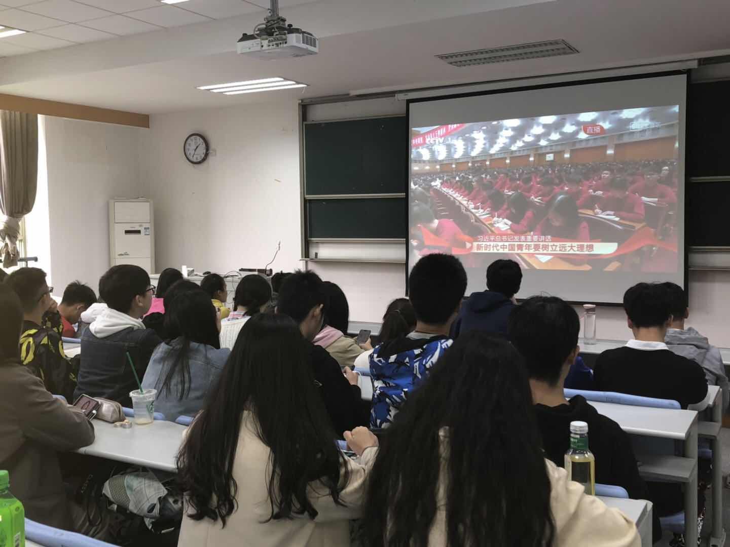 学生各班级在教室组织收看纪念五四运动100周年大会
