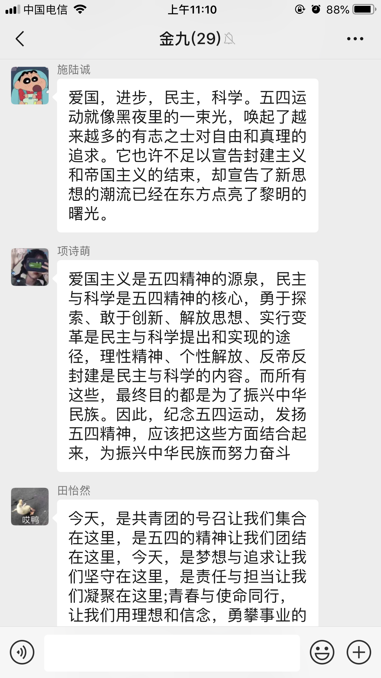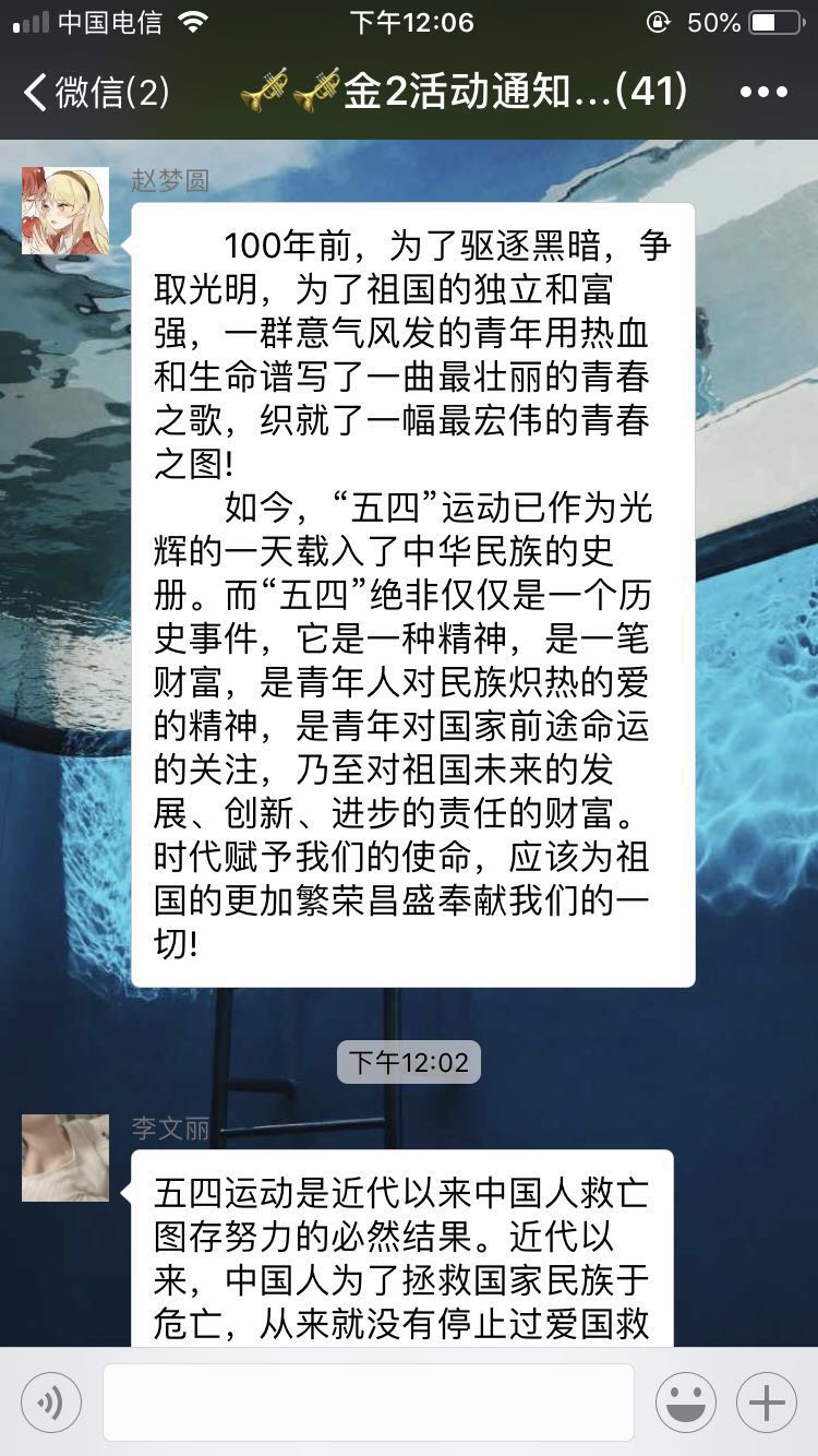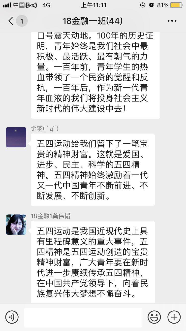 团员青年在微信群中热议纪念五四运动100周年大会