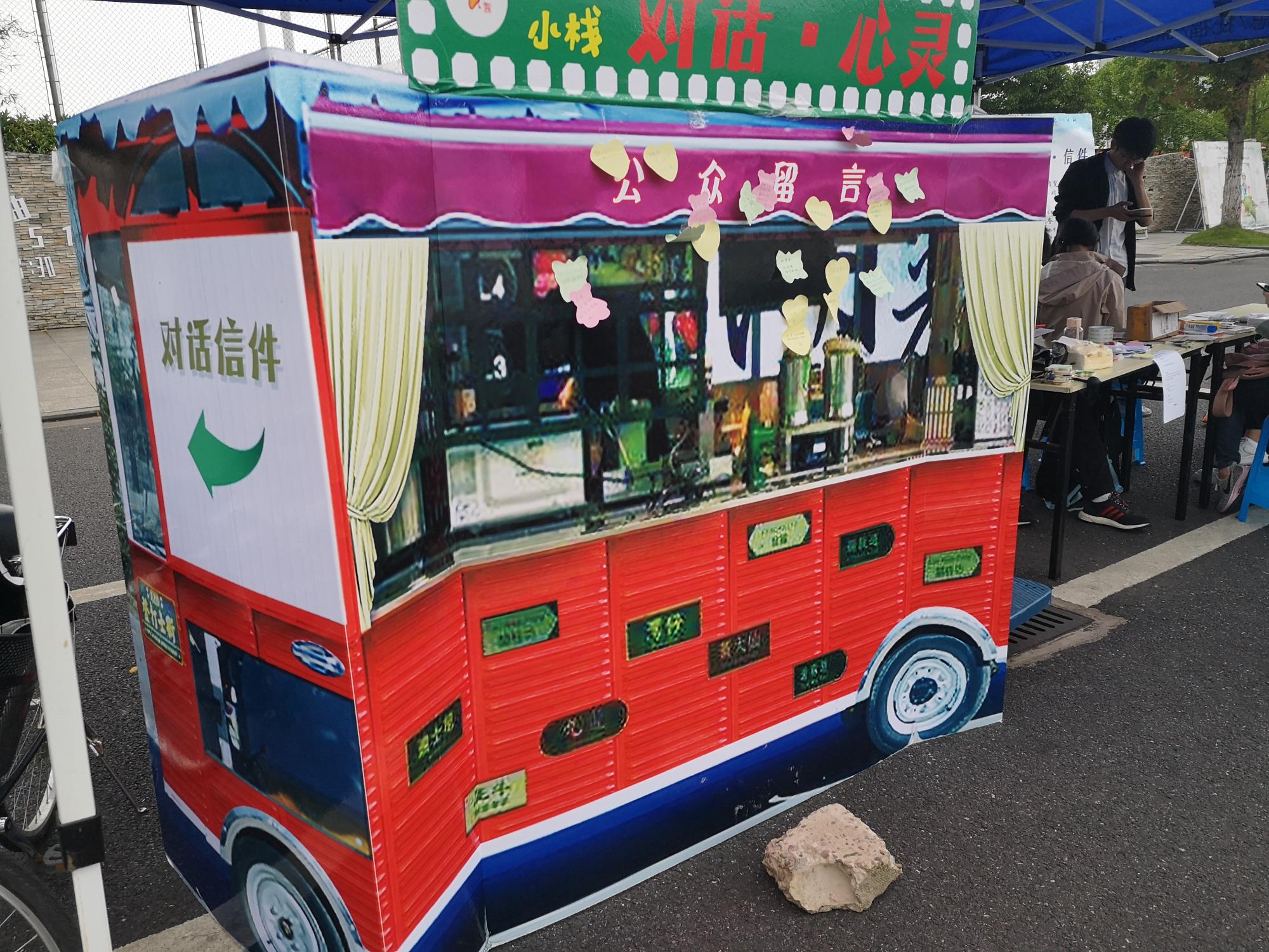 5月13日下午1点,校园文化长廊里出现了一个手工制作的“红色餐车”,车头、车身和车尾分别有“对话信件”、“公众留言”和“树洞”的标识。“对话信件”指向放满各色图案明信片的桌子,想要解忧的同学可以在明信片上写下自己的烦恼等待他人解答,并抽取别人的烦恼予以回复。“公众留言”是餐车的中部,以温馨的餐车窗口作为底色,希望宣泄烦恼和释放压力的同学可以选择将写有文字的便利贴黏在留言板上,也可以阅读留言板上的内容,用同样的便利贴进行回复。“树洞”则是另一处有趣的设计,想要倾诉心声却又不希望内心苦楚暴露的同学可以将写好的纸条投入到布置好的树洞内,将那些不可轻易示人的秘密、引而不发的情绪和难以启齿的柔软向无声处诉说,然后视那沉默的回应为生活作出的解答,将内心的答案看作是对方给予的回复。