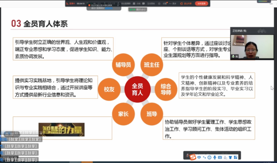 谢敏副书记介绍了学院学生管理工作。学院积极贯彻“全员育人”的教育理念,辅导员、班主任、综合导师、家长、班导、校友在学生健康成长中均发挥了重要作用。她还介绍了黄色仓库