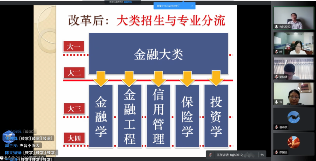2021届毕业生升学情况和八大学术型社团,积极鼓励同学们在课业之余提升素养,强化实践能力,培养创新思维,追求全面发展。最后,谢书记从学业问题、心理问题、诚信问题、安全问题等方面提出了大学学习生活的建议,表达了学院重视学生全面健康发展的态度,希望加强家校联系与互动,锻炼学生独立自主能力,培养出色的金融学子。