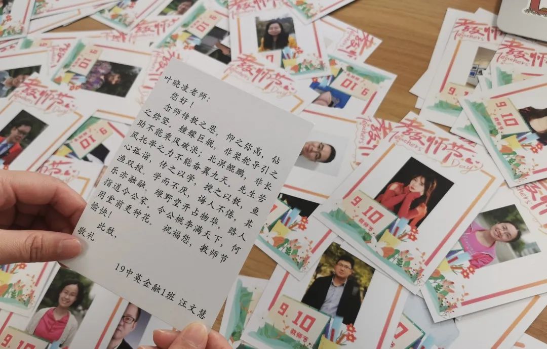 “这张卡片暗藏玄机,打开后里面放着老师的照片,照片背面是我们绘制的卡通版老师形象” 活动负责同学范家昕说,“另一边是我们想对老师说的话,一周前我们就开始向学院同学征集写给老师们的心里话,短短几天就收到几百条留言。封面设计也非常用心,我们以‘师恩难忘’为主题设计了贺卡封面。”