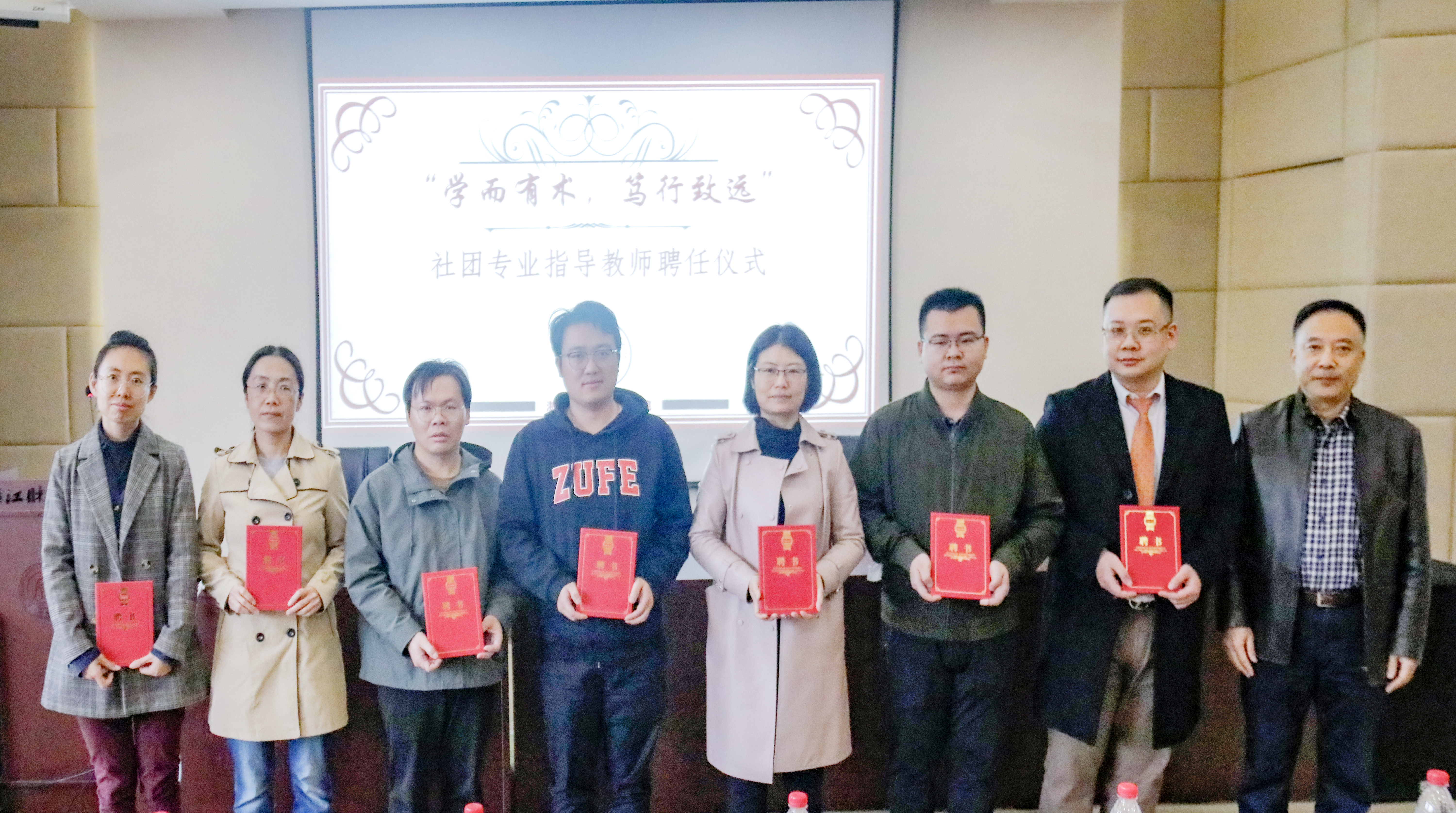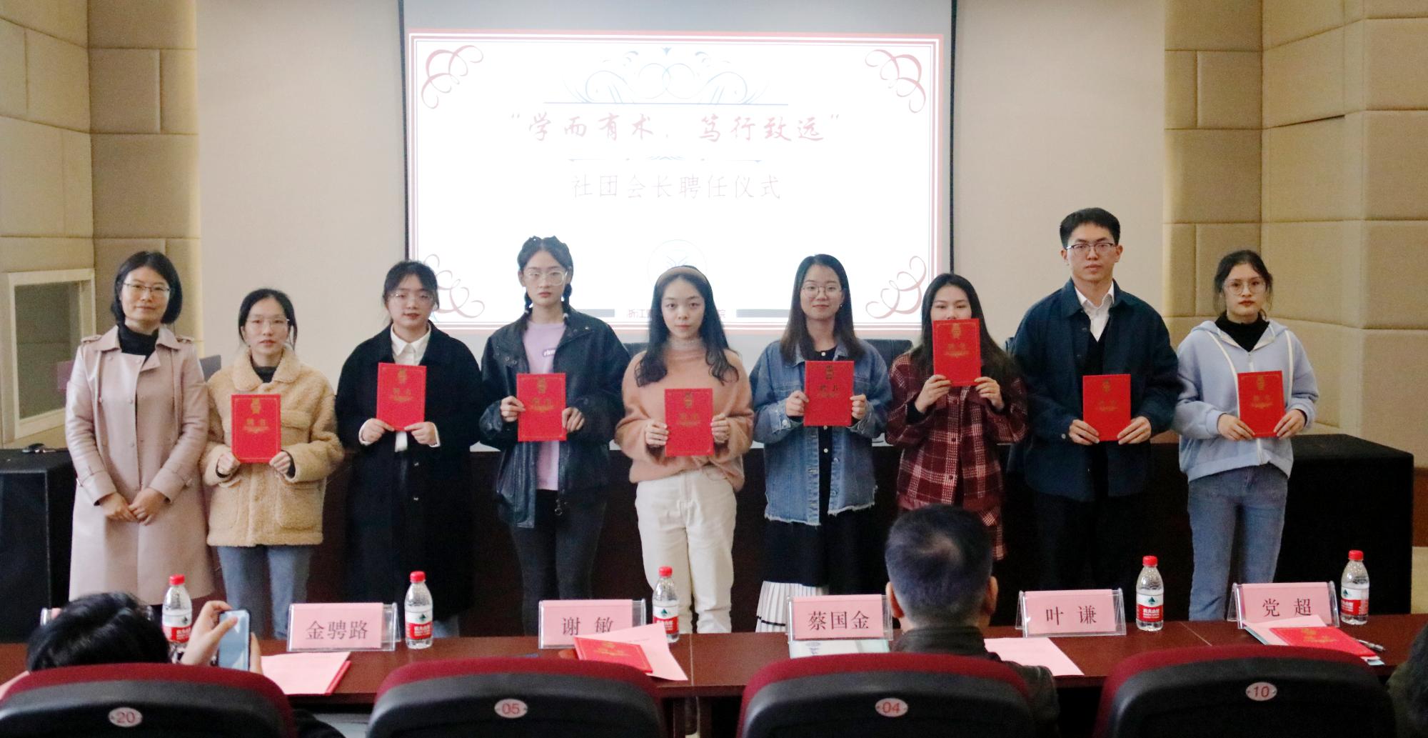 接着举行了八大学会专业指导教师及会长聘任仪式,蔡书记和谢书记先后为学会专业指导老师和新任学会会长颁发了聘书。