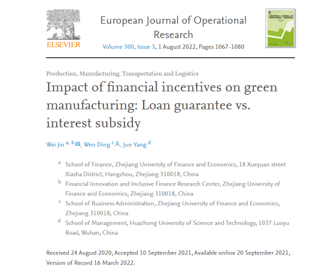 副教授金伟与合作者丁雯博士(工商管理学院)、杨珺教授(华中科技大学)的论文“Impact of financial incentives on green manufacturing: Loan guarantee vs. interest subsidy”在国际权威期刊《European Journal of Operational Research》第300卷(2022年)第3期正式发表。该期刊被SCI一区检索,为ABS4星级、FMS A类期刊。论文链接://doi.org/10.1016/j.ejor.2021.09.011