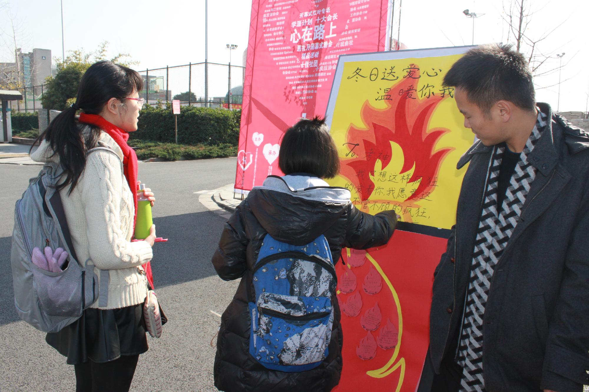 团委学生会主办的“冬日送爱心,温暖你我他”的一元钱工程活动在文化长廊顺利开展。为增进同学间的友谊,同时助力“一元钱”工程,组织部的成员将亲手制作的卡片进行义卖,同学们通过募捐一元钱获得一张卡片并可写下自己的祝福,传递爱心。