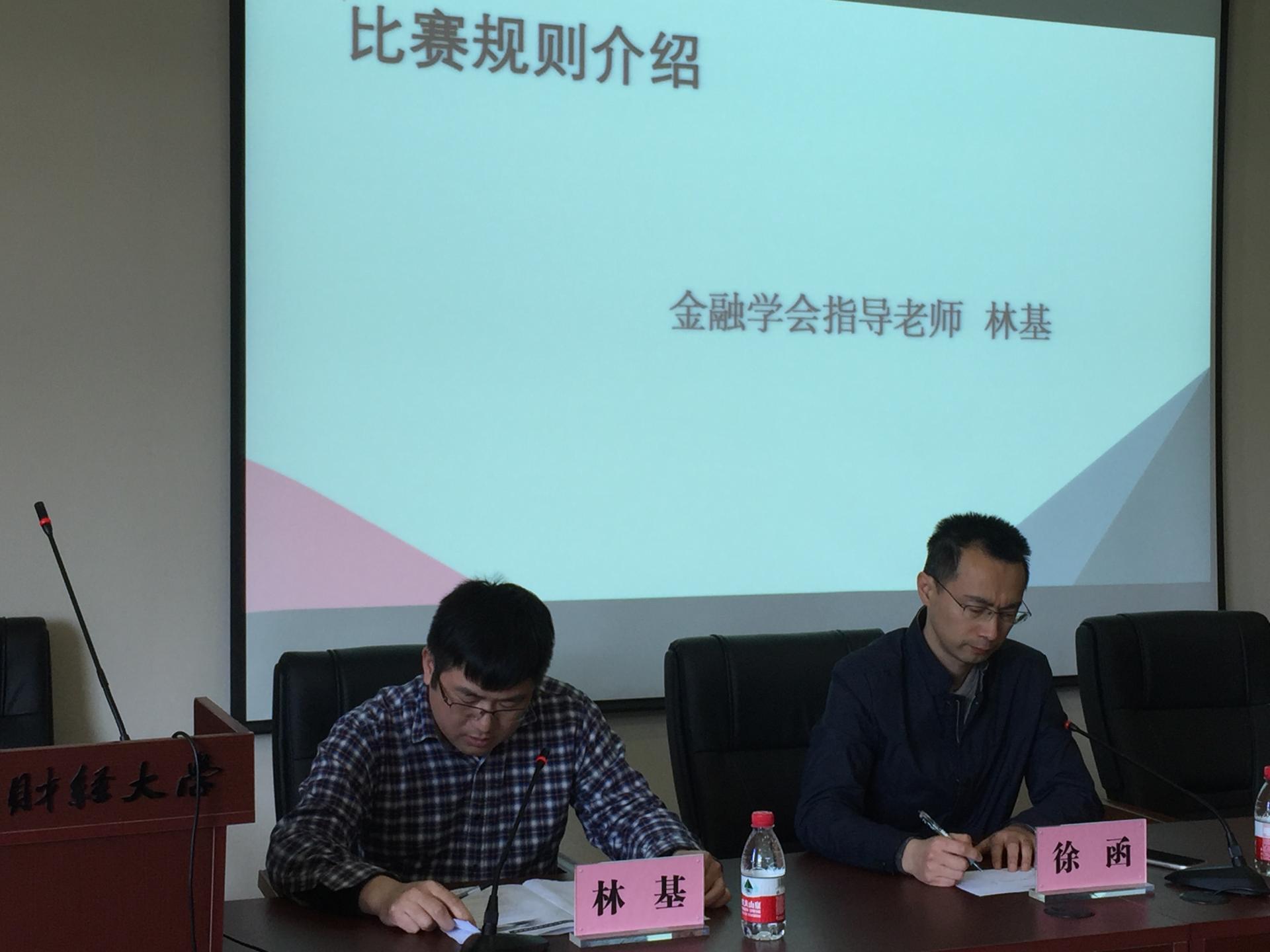 副院长王聪聪老师致辞。王院长对比赛的内容及性质做了具体的介绍,并鼓励各学院学子们踊跃参加,挖掘潜能。其次,由金融学会指导老师林基老师为我们解读本次竞赛的省赛方案、校赛方案及具体的比赛规则。后来,金融学会行政指导老师吴轶韵老师向我们介绍了比赛的相关奖励,重点强调了校方对本次比赛的重视,及对该方面人才的看重。接着,浙江省大学生证券投资竞赛办公室主任徐函