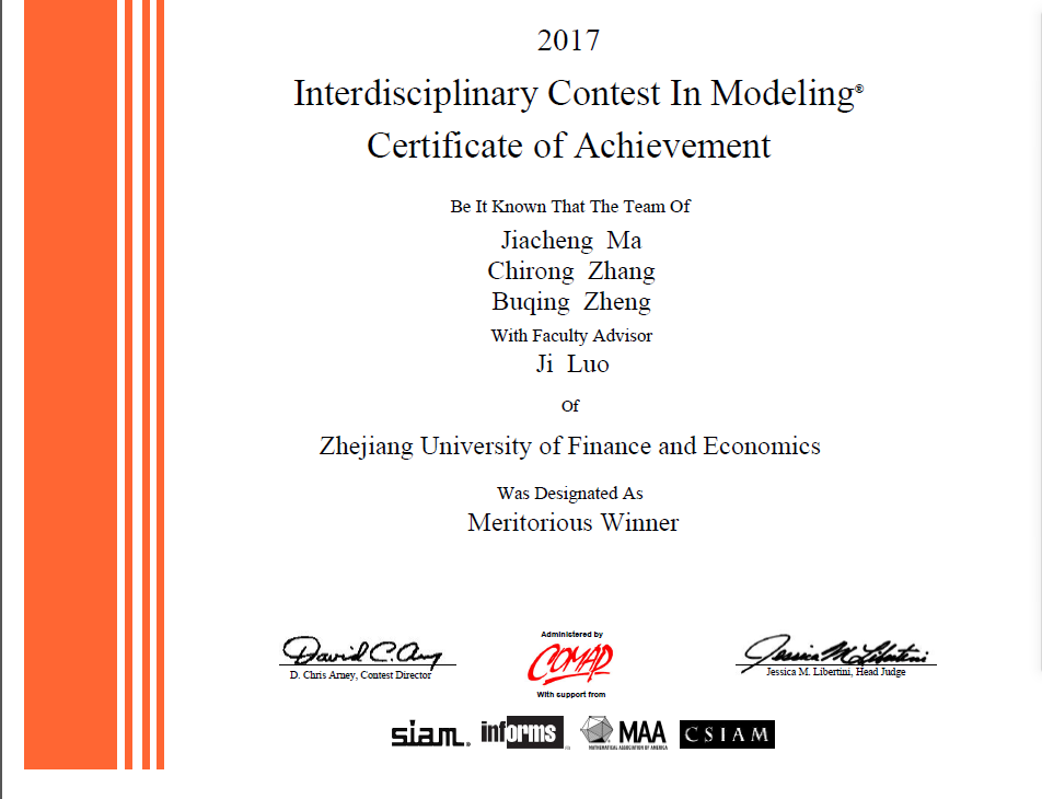 14金工1班张弛融、13金融1班郑步青、14金融2班马嘉诚组成的队伍荣获国际一等奖。