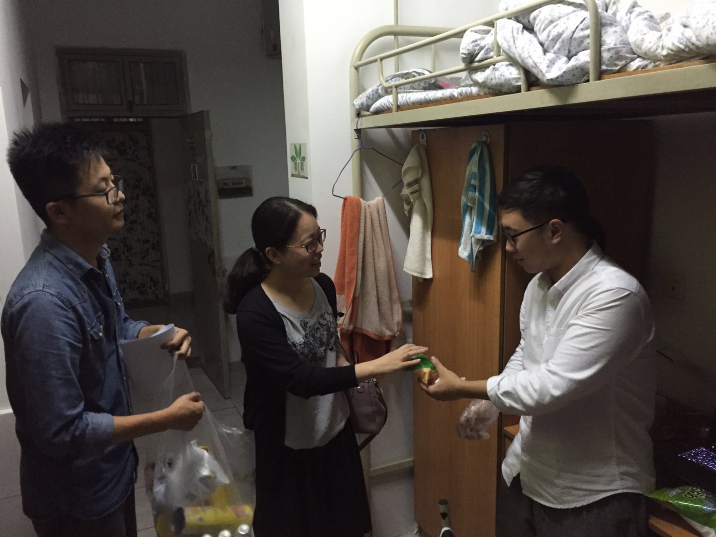 10月4日,学院党委副书记叶秀、团委书记蒋超、辅导员沈耀杰看望慰问了留校的考研学子和参加军训的2017级新生。