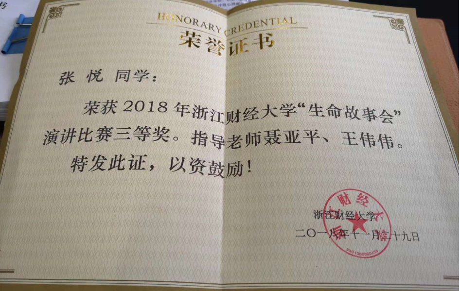 经过激烈角逐,黄色仓库 18金融3班张悦以《生命,要有它的样子》为题的演讲获得三等奖。