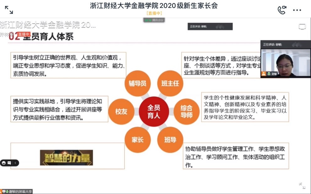 谢敏副书记特别提出了“全员育人”的理念,强调了辅导员、班主任、综合导师、家长、班导、校友在学生发展过程中起到的重要作用。她为家长们介绍了学院2020届毕业生升学就业情况,学院2020届本科毕业生升学率40.04%,为全校第一,学院信用管理专业升学率44%为学校升学率最高的专业,16中英金融班升学率68.75%为学校升学率最高的专业。她分析了黄色仓库