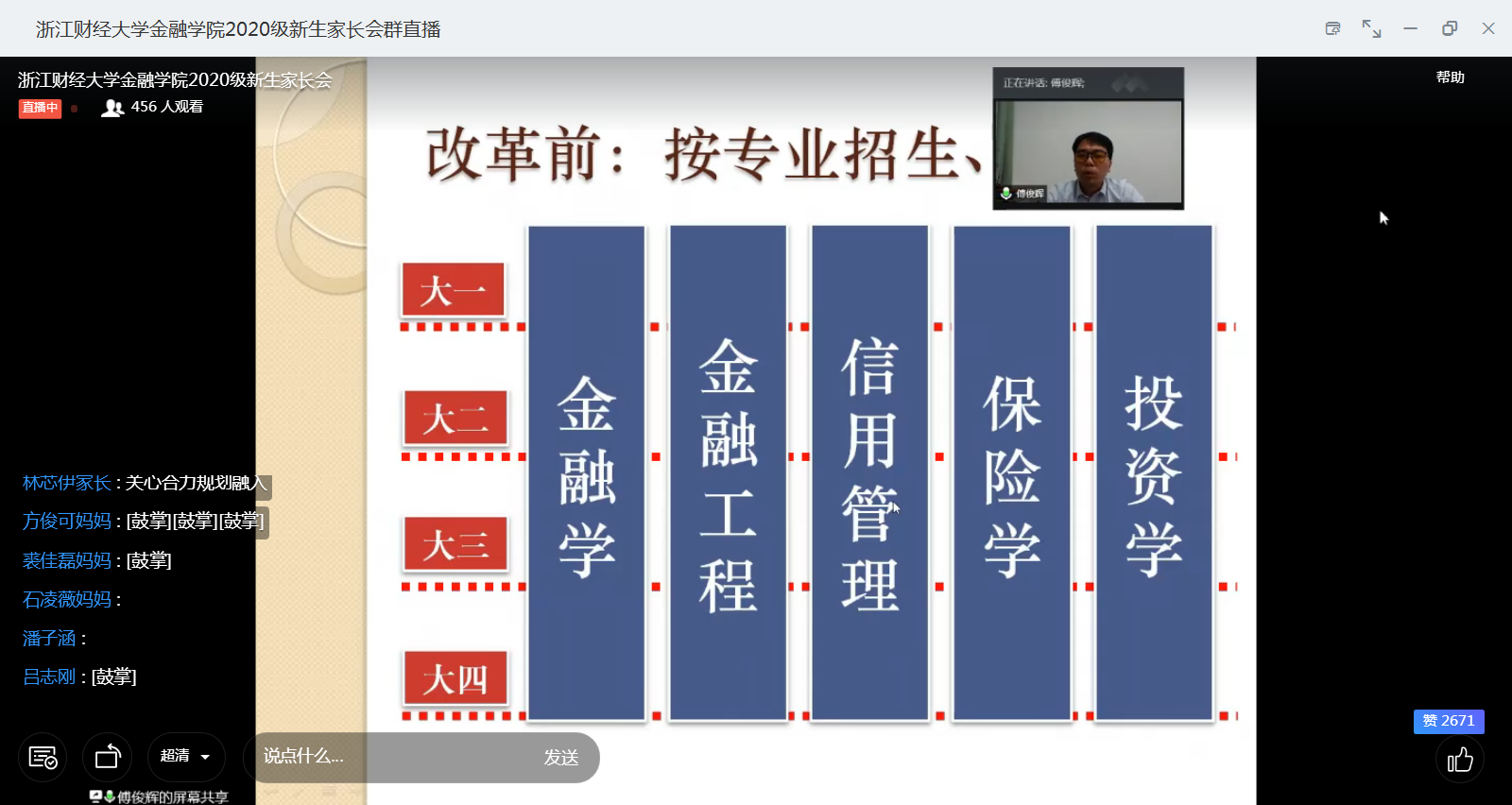 始于1986年的基建财务与信用系,历经多年的积淀和发展,目前拥有本硕博完备的教学培养体系,已形成对接新金融、服务地方经济的特点,培养的学生受到用人单位的广泛欢迎,被誉为浙江省“银行家的摇篮,金融高管的沃土”。最后,他希望广大家长能关心学生在校期间的学习生活和学院发展情况,也希望同学们尽快融入大学生活,早日做好大学规划,为成为金融行业的排头兵而努力奋斗。