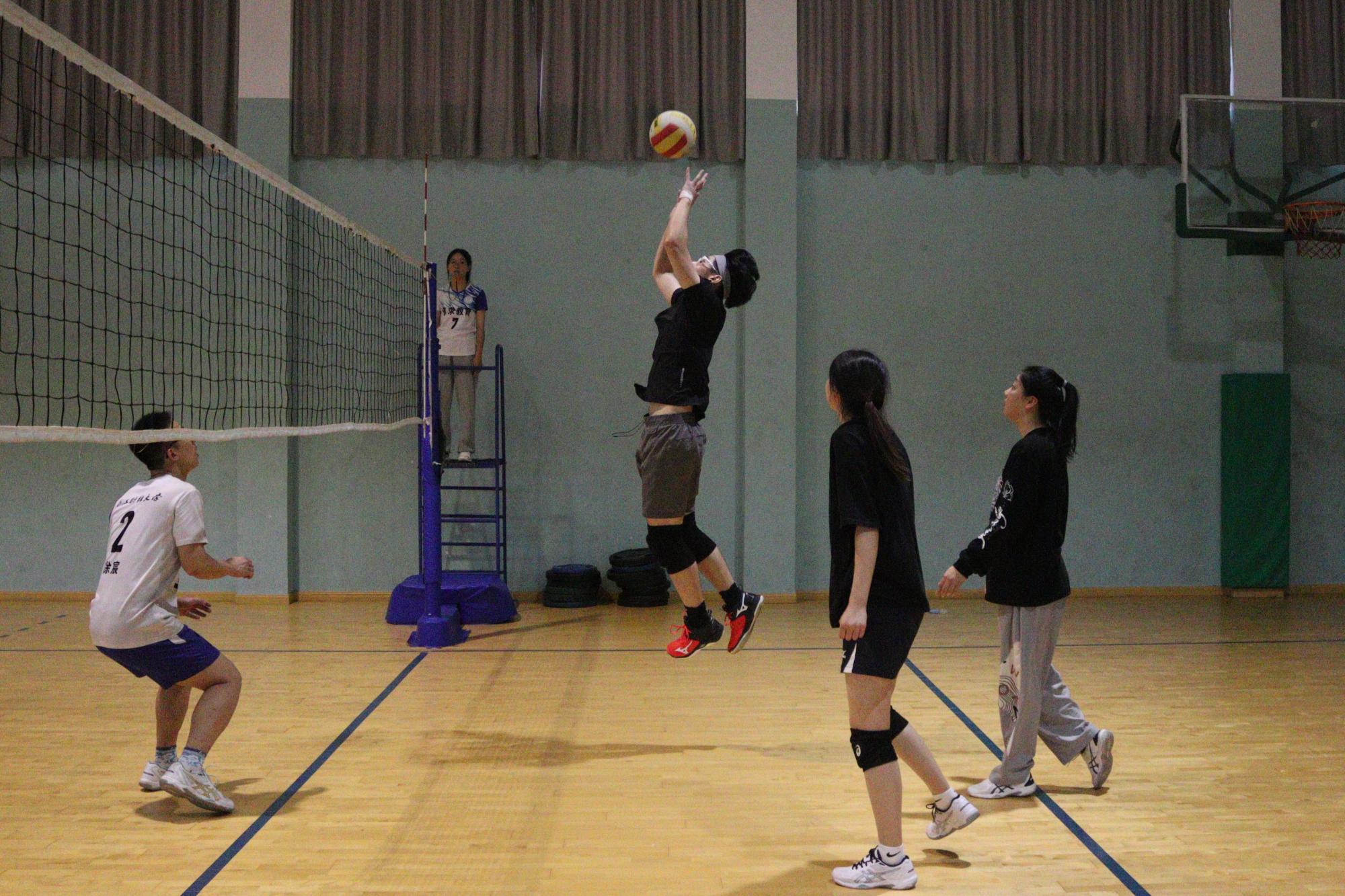 排球队士气高涨,在第三场比赛中以18:16打破平局,险胜研究生学院。