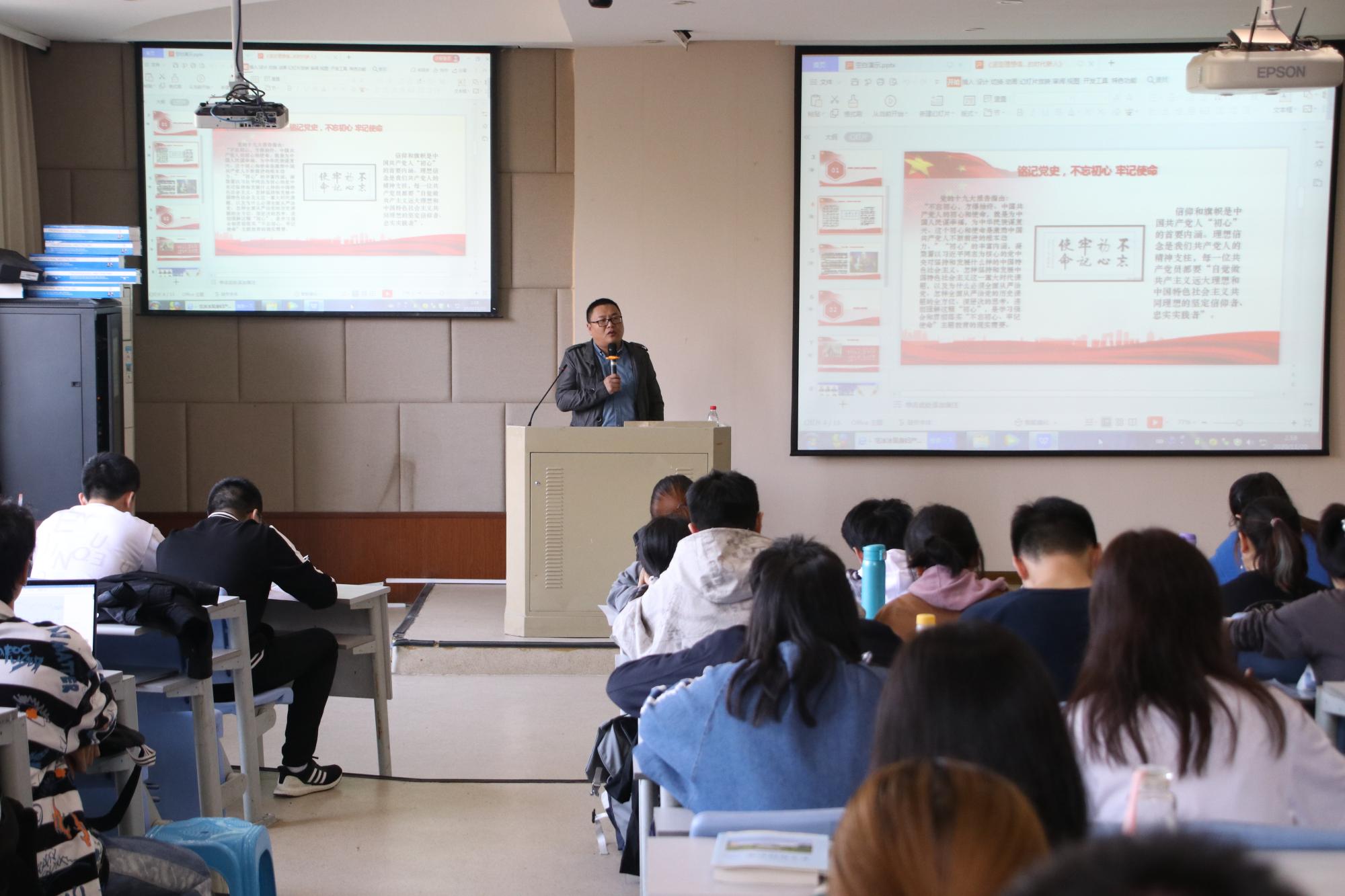 段雪辉书记以《铭记党史,不忘初心,牢记使命》为题,讲到作为大学生预备党员,理应肩负起时代民族复兴大任,应当坚持马克思主义理想信念不动摇。他用《人民的名义》中的经典片段,生动具体地展现了老一辈革命家的入党初心。青年兴则国家兴,青年强则国家强,作为青年党员,更应该加强学习、担当作为,用美好青春诠释共产党人的初心使命。