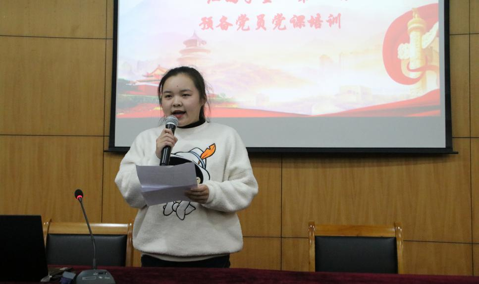 最后,童玉玲书记对全体学员提了两点希望。一是坚定自己的理想信念,做红色的鸿鹄,心怀人民,志存高远。二是时刻牢记自己肩负的历史担当与责任,不断培养自己的党性修养,不光做到从形式上入党,更要从思想与实际行动上入党。