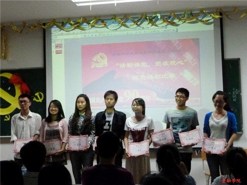 观众在欣赏完精心准备的节目后,积极踊跃地参加了党史知识回答的游戏,现场气氛达到了高潮。随后,主持人宣布了话剧比赛最终的结果,08金1的《红色生死恋》凭借其逼真而感染力十足的表现获得一等奖,08金工、08金3获得二等奖,08保险、08信管、08金2获得三等奖,第三党支部和第四党支部获得优胜奖。最后,备受瞩目的最佳话剧男女演员奖揭晓。08金3王若洁凭借其对江姐誓不叛党、坚强不屈个性的演绎摘得最佳女演员的桂冠,08金工曹光峰反串喜儿,幽默风趣的语言、夸张搞笑的动作、极富感染力的声音助其获得最佳男主角的称号。