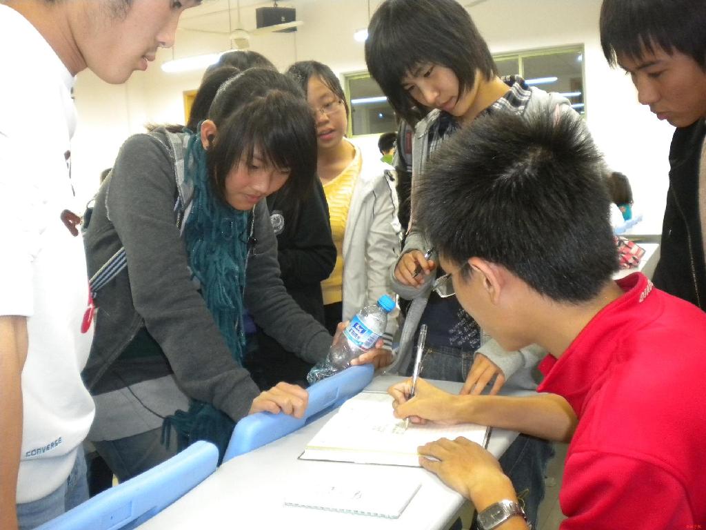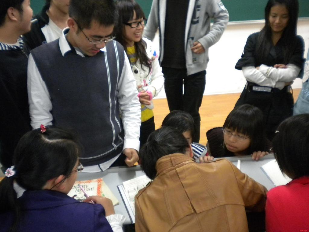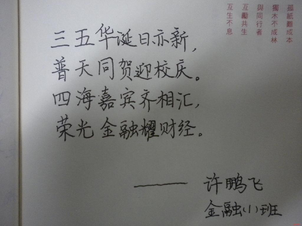 每位同学手中传递。大家都踊跃地参加,拿到本子的同学总是小心翼翼得翻开。每一位同学都选取了自己喜欢的一面,思索片刻,认认真真地写下了:“财院,生日快乐!”,其他还未轮到的同学纷纷围住他,也迫不及待地想上去露一手。没用多少时间,本子就丰富多彩起来了,上面有工整的文字,有造型别致的插画,还有自创的一句诗,一段词,花样百出。精美的本子经过同学们灵活精心的创作后,变得更加完美,分量也沉甸甸起来,因为上面记载的是90后新生们对母校真诚的祝福和希望。