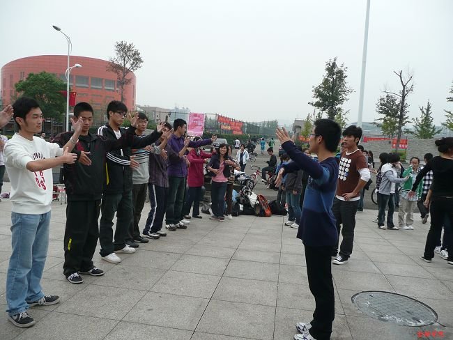 下午12点30分,最先展开的是“舞动校园”的造势活动。工作人员向来往的同学们派发活动倡议书,鼓励大家参加稍后的华尔兹培训、参加“舞动校园”的活动,并号召同学们在“献礼母校,共舞青春”的横幅上签名为母校祝福。这一来可吸引了不少同学的目光,大家纷纷上前签名、询问,表现出极大的热情与兴趣,更有不少人当即报了名。