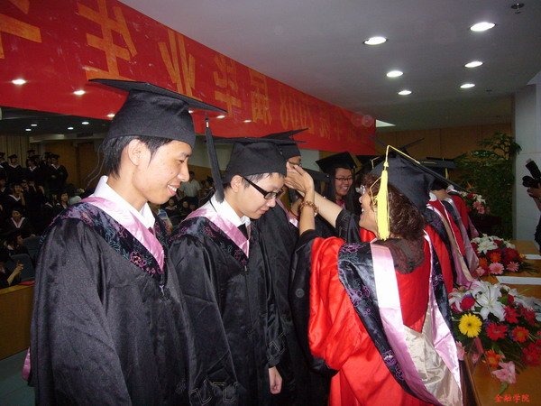 接下来,整个典礼仪式最激动人心的场面随之出现了——毕业生上台接受拨穗。每一位走上台去接受拨穗的毕业生脸上都洋溢着激动幸福的笑容,看着领导老师们亲手为毕业生拨穗,台下的同学、家长则用手中的相机不停地拍着这最神圣而又难忘的时刻,闪光灯此起彼伏、掌声笑声连绵不断。每一个走上主席台的毕业生都想和台上的领导老师们多待一会儿,而台下的毕业生却又迫不及待地要上去,每一个人都陶醉其中,不停息的掌声笑声、相机快门的咔嚓声交织在一起,把典礼的气氛不断推向高潮。