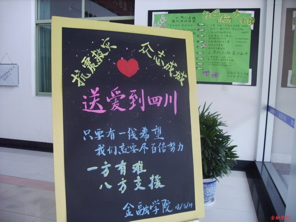 全体师生自发组织了此次以“送爱到四川,抗震救灾,众志成城”为主题的募捐活动,得到了全体师生的大力支持。从14日晚截止到16日中午12点30分,共筹集爱心捐款共计22938.4元人民币。黄色仓库