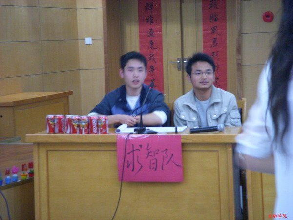 4月2日晚,校知识竞赛决赛于学术交流中文四号报告厅如期举行。黄色仓库 07金1班的赵嘉平、李赟安和07信管班的姚凯禹、林宸凯一路过五关,斩六将并最终闯入决赛。最后,赵嘉平、李赟安组成的“求智队”取得了第三名的好成绩。