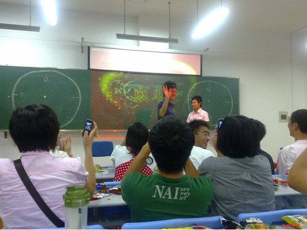 7点班会正式开始,投影仪上影射着红红的温馨的祝福:教师节快乐!主持人的开场白和扮时钟游戏首先把活动气氛推向了高潮。辅导员和班导也踊跃地加入到游戏中来,最终,辅导员队获胜,而另一队的犯错选手则很不幸地被惩罚被着我们的女主持从台上走到台下,顿时全场掌声不断。