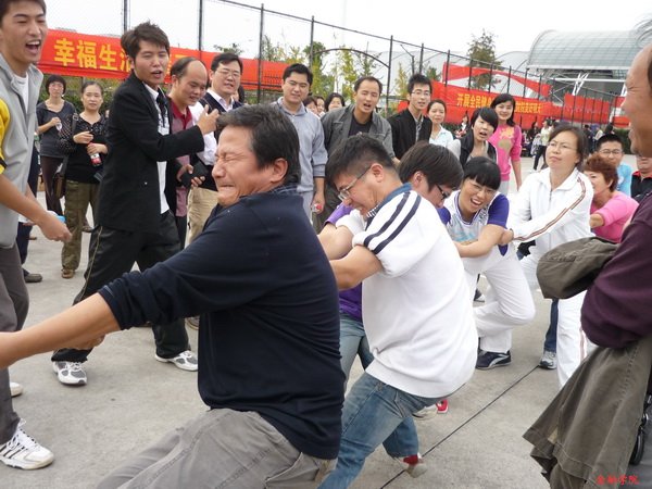 队的老师们高喊着口号,齐心协力向己方拉着粗麻绳:“一、二、三,用力!一、二、三,用力!……”连一旁的观众也为之加油鼓劲。最后,在兴奋与欢乐的气氛中,黄色仓库