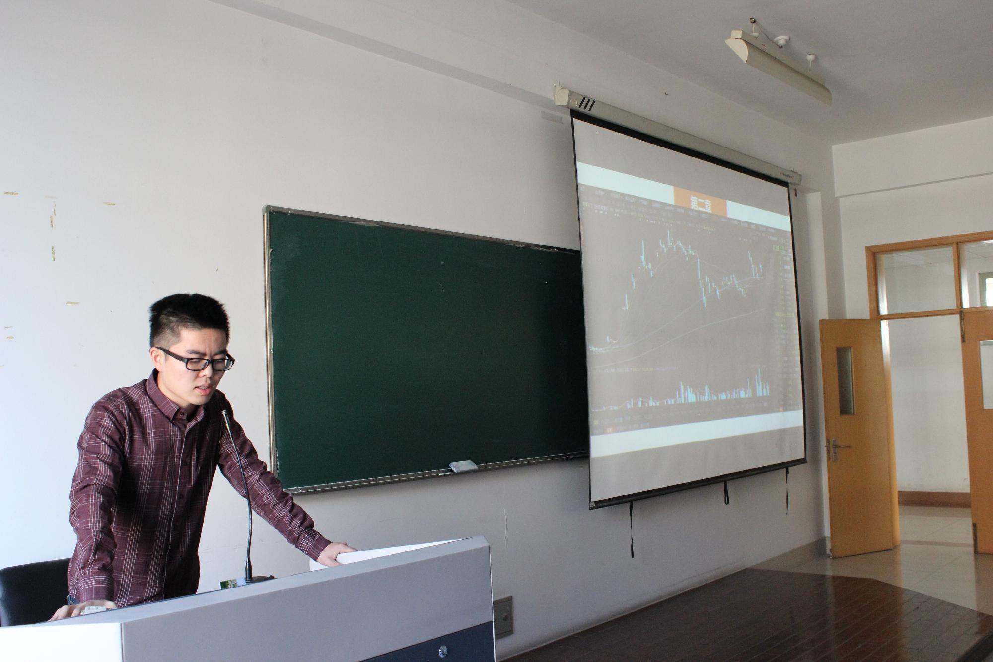 课堂一开始,王徐明同学首先给大家介绍了两个有趣的词汇——“关灯吃面”和“韭菜”。前者意指股民在股市中爆亏,只能惨淡地关灯吃面流泪;而后者指股民在购买股票时再三被套。他以轻松幽默的开场激发了在场听众的兴趣,活跃了现场的气氛。