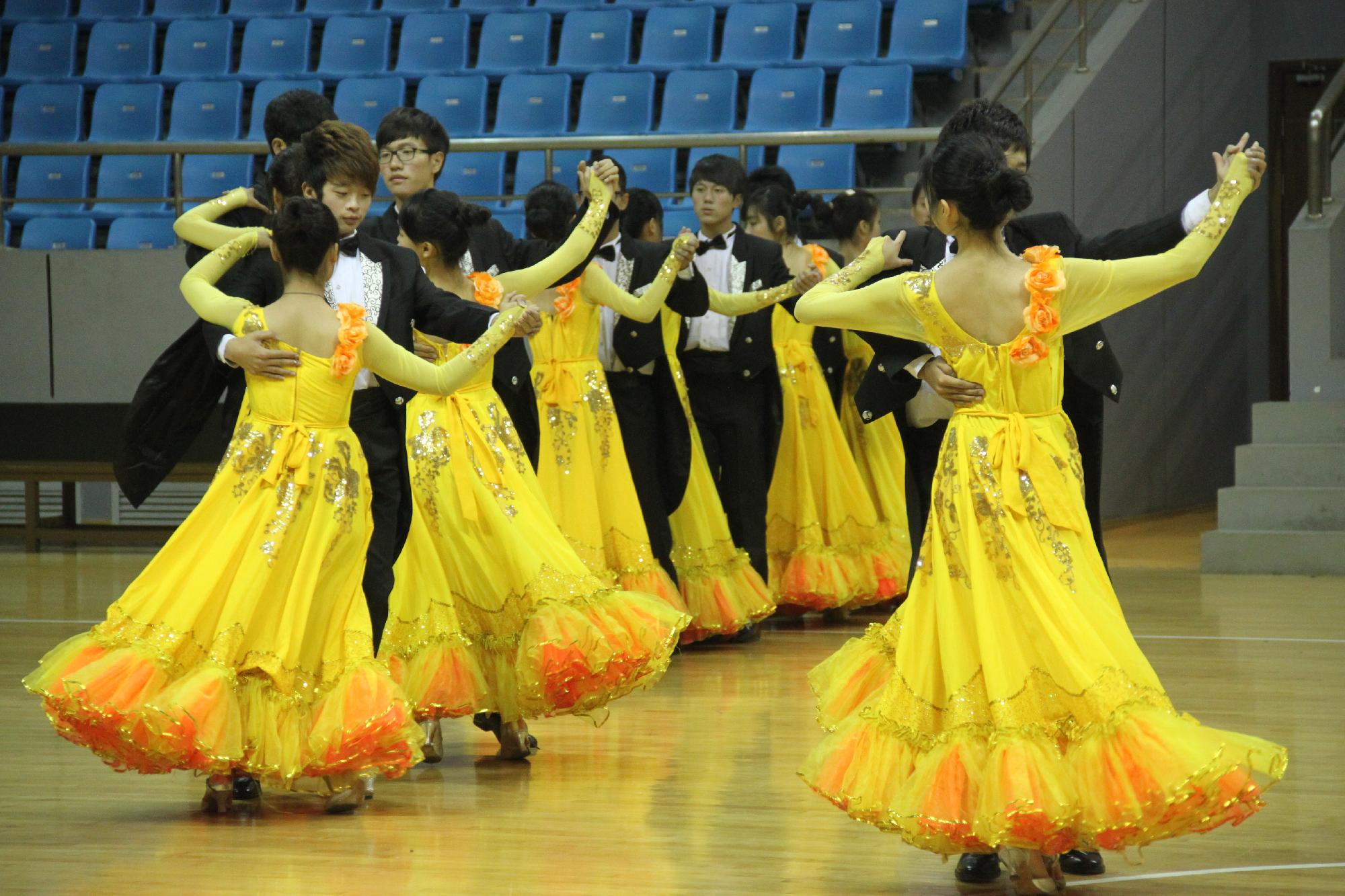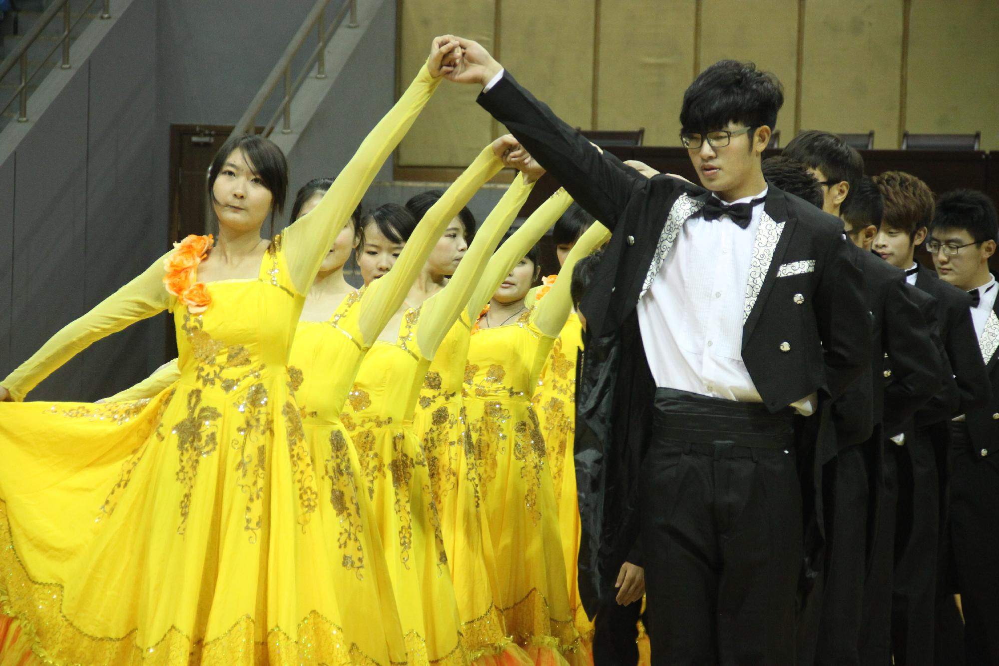 近日淅淅沥沥的雨和骤降的温度丝毫没有减退各学院同学的参赛热情,他们早早地来到了体育馆化妆、换服装、练习,为比赛做好充分的准备。在简单的彩排之后,比赛准时开始。首先进行的是伦巴单人和双人的比赛,选手们华美的服装、优美的舞步博得了全场评委和观众的赞美。随着比赛的进行,选手们将训练的成果一一展示出来,引来了观众们的阵阵欢呼。在集体舞华尔兹环节,黄色仓库