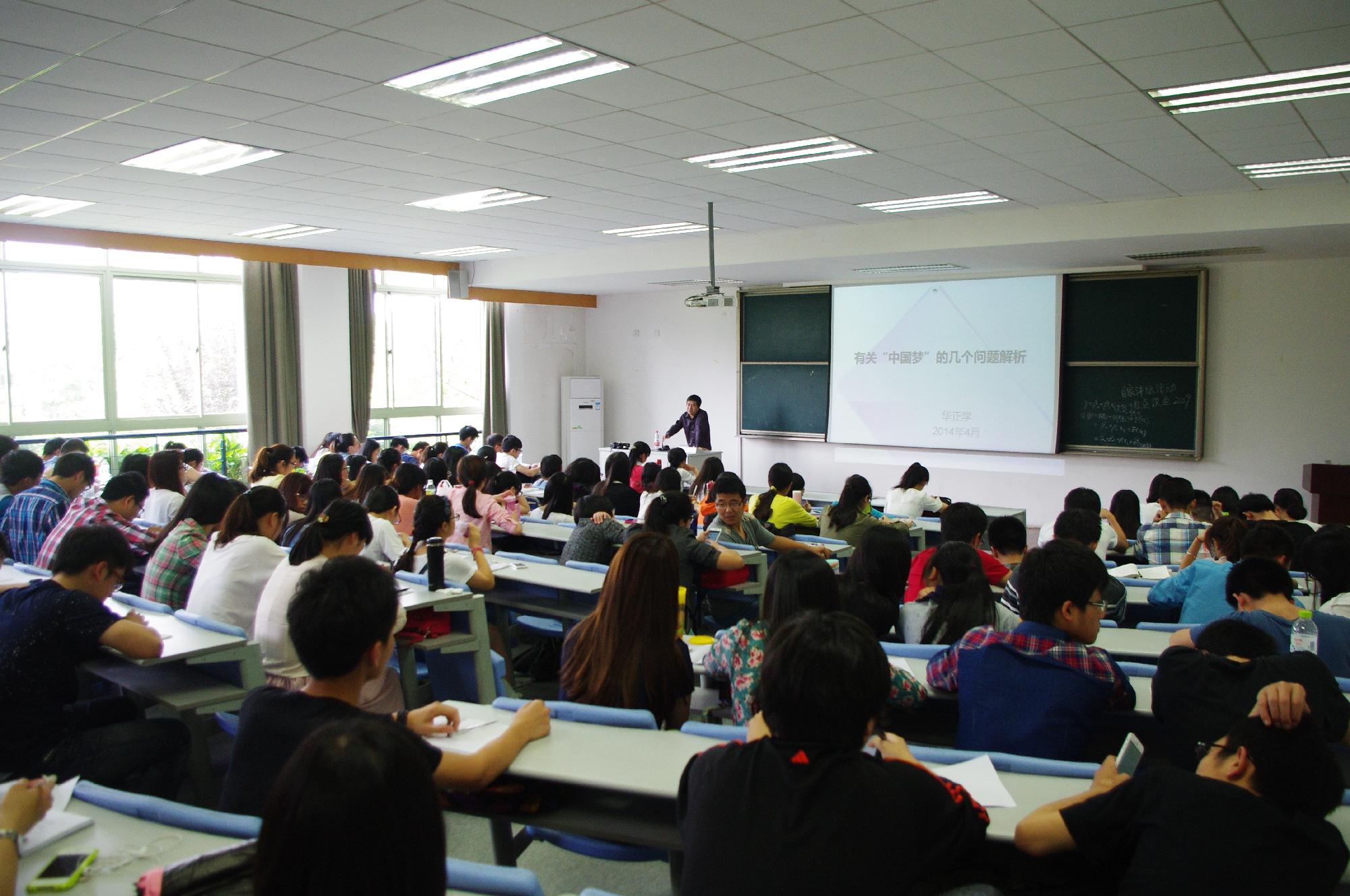 华正学老师分别从“中国梦”的内涵、由来和发展、政治诉求、实现途径、鲜明特色及凝聚乐观自信六个方面对“中国梦”进行深刻的解析。首先,老师向大家阐述了中国梦的主旨:中国的伟大复兴,并列举了十八届三中全会后习近平主席领导下的中国外交发生的变化,说明了在“中国梦”的影响下中国在国内和国际两个方面的发展。随后,华正学老师引用了习近平主席讲述“中国梦”时所说的话:中华民族无侵略他人的基因,解释了“中国梦”产生的原因,并提出“其实‘中国梦’并不是近期提出的,而是自古就存在的”。另外,华正学老师还向同学们分析了“中国梦”拥有的鲜明特色,即人数众、时间长、层次多、情况复杂,并列举了“中国梦”和“美国梦”之间的五大差异。他强调,当今中国对于整个世界既面临机遇,又面临挑战,并以此列出“中国梦”的五大政治诉求,说明了“中国梦”对于中国的发展是必不可少的。最后,华正学老师指出,对于实现“中国梦”,我们应共同凝聚乐观自信,应该跟随中国共产党的领导,使中国走上正确、快速的发展道路。