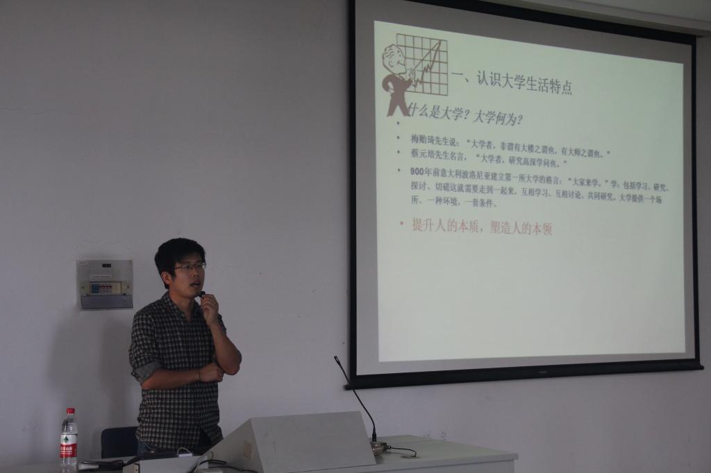 政治辅导员尹怀玉老师主讲。尹老师就大学生自我形象的塑造,为人处世的方法和学习习惯的养成三个方面对15级新生进行了指导。