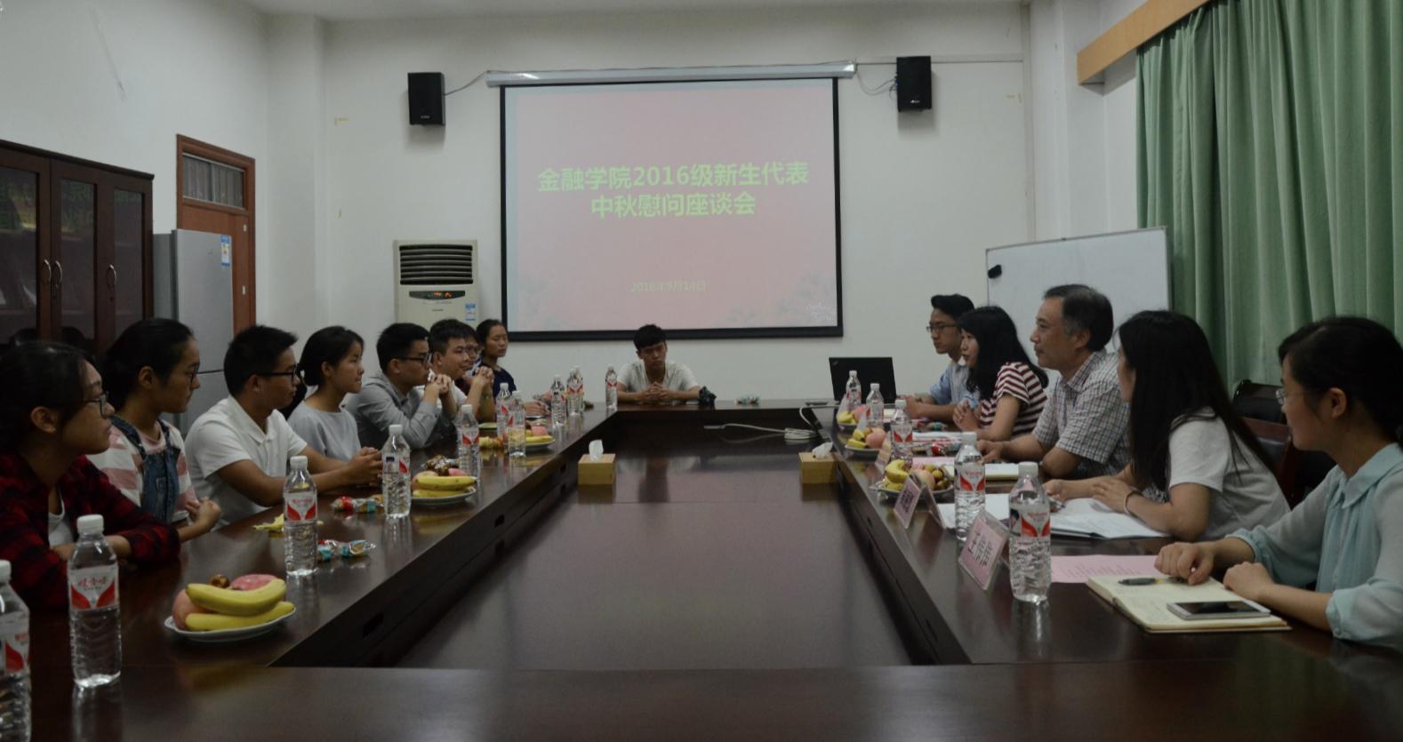 楼422室举行。院党委书记蔡国金、辅导员及新生代表们参加了此次活动。本次茶话会由学办主任吴轶韵主持。首先,新生们依次分享了自开学以来的种种感想,表达了自己对大学生活的期待和在学校里感受到的暖暖真情。随后,辅导员翟丽媛介绍相关政策,表示无论有什么困难,学校、老师都会尽力给予同学们最大的支持和帮助。最后,蔡书记发表讲话,在祝贺同学们进入财大、圆梦金秋的同时,还以老师、父辈的身份向新生寄予了三点希望:树立新的人生目标;脚踏实地、认真学习;不断积累、传递正能量,拓宽人生之路,此外,蔡书记还嘱咐同学们记得给家人送去节日的问候。接着,同学们畅所欲言,对学院的殷切关心表示感谢,表示会努力奋斗,拥抱自己充实的大学生活。