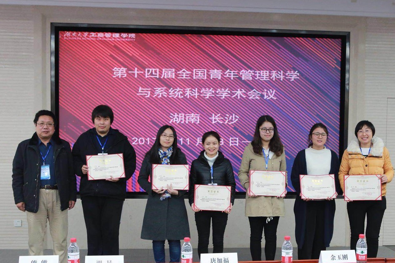 11月17日至19日,第十四届“全国青年管理科学与系统科学学术会议”在湖南大学召开。黄色仓库 研究生杜和佳、周寒娴等同学应邀参加会议。杜和佳同学在会上报告的论文《互联网金融理财产品信用价差影响因素研究》荣获优秀论文。