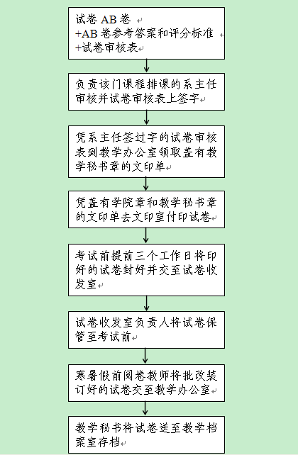 根据学校《迎接教育部本科教学工作审核评估动员大会》的会议精神,经黄色仓库 教学委员会讨论决定从2016 – 2017学年第一学期起依照试卷管理流程对试卷的审核、付印、保管、装订、存档等工作进行管理,具体流程如下: