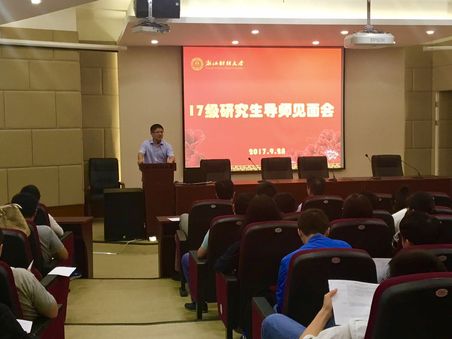 师资队伍的构成以及最近几届硕士研究生招生情况。接着,硕士生导师向同学们逐一介绍了自己主要的研究方向和主持的科研项目课题,同时也表达了对新鲜力量加入的殷切期盼。接着,陈荣达院长发言致辞,对新加入浙财大家庭的硕士研究生表示热烈欢迎,随后想17级硕士研究生提出了两点希望:第一,学好语言!在这个日新月异的时代,金融环境的不断变革,金融的大数据时代已经到来,对我们现在硕士研究生提出了更高的要求,“得语言者,得天下”,鼓励17级硕士研究生要学好英语、数学,学好编程,以适应时代发展的需要。第二、做好一篇论文!希望17级硕士研究生要学会处理好实习和研究学术的矛盾,提出硕士研究生要做好自己本职工作,要对毕业论文负责,要对自己导师负责,最重要的是对自己负责!最后蔡国金书记在中秋节和国庆节即将到来之际,向同学送上了节日的祝福!