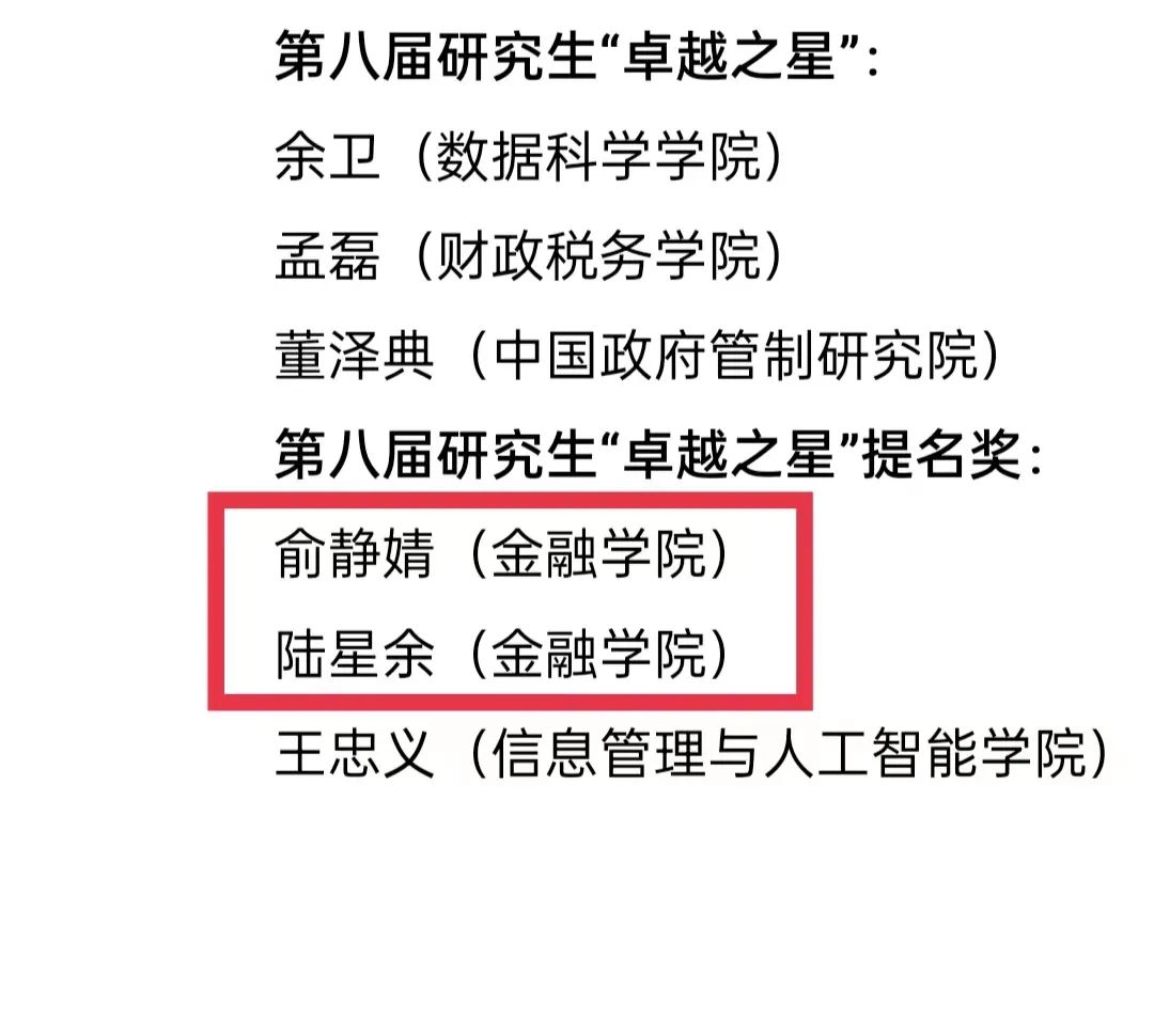 热烈祝贺黄色仓库 20级博士研究生俞静婧、21级硕士研究陆星余荣获第八届研究生“卓越之星”提名奖!