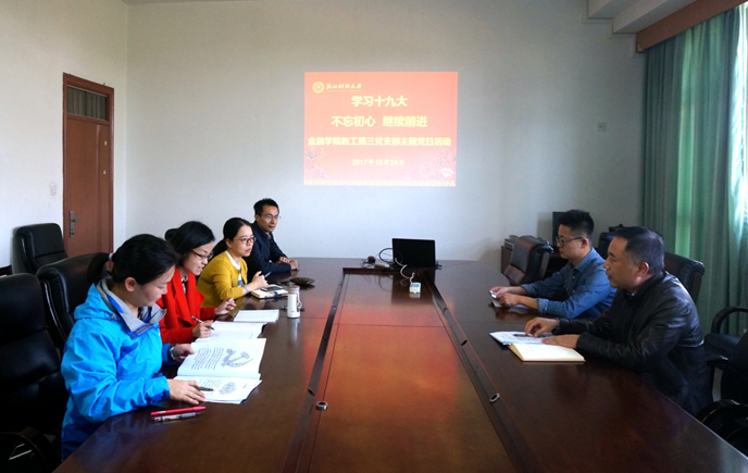 教工第三党支部在学院楼418会议室开展“学习十九大,不忘初心、继续前进”主题党日活动。对十九大报告中出现频率最高的“发展”、“人民”、“建设”等词语进行详细解读,并对十九大报告原文进行的通读和讨论,尤其是和经济、金融、教育、一流学科建设等有关内容进行了认真学习。大家表示接下来会继续认真学习十九大相关文件内容,吃透精神,与各自的工作相结合,为学校和学院的发展更上台阶出一份力。