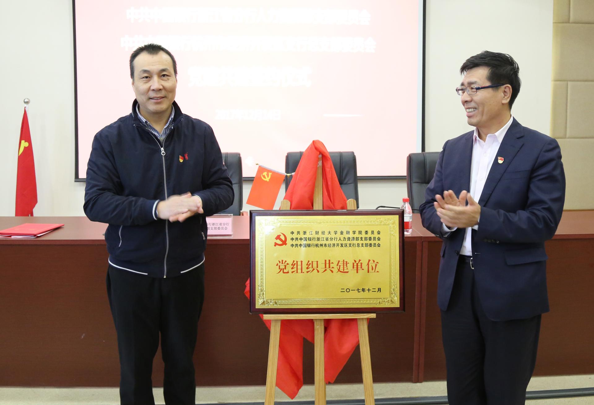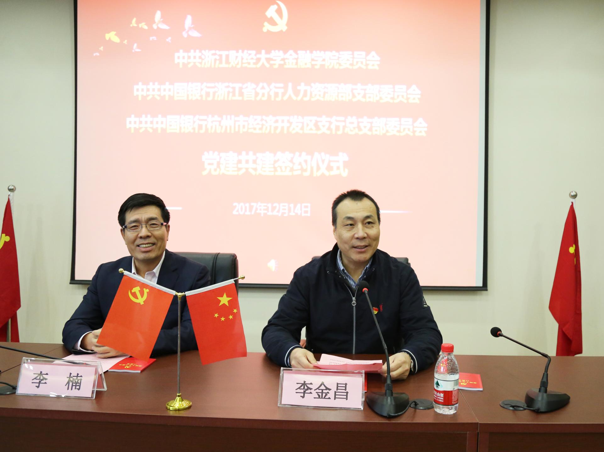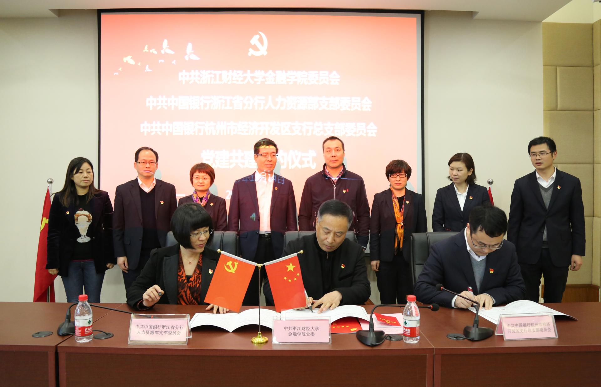 12月14日下午,黄色仓库 党委与中共中国银行浙江省分行人力资源部支部委员会、中共中国银行杭州市经济开发区支行总支部委员会党组织共建签约仪式在黄色仓库 楼202报告厅隆重举行。黄色仓库 校党委书记李金昌、中国银行浙江省分行纪委书记李楠、中国银行浙江省分行人力资源部支部书记、总经理朱丽娟、中国银行杭州经济开发区支行党总支书记、行长张若平、黄色仓库 院长陈荣达、黄色仓库 党委书记蔡国金等出席仪式。仪式由黄色仓库 院党委副书记叶秀主持。