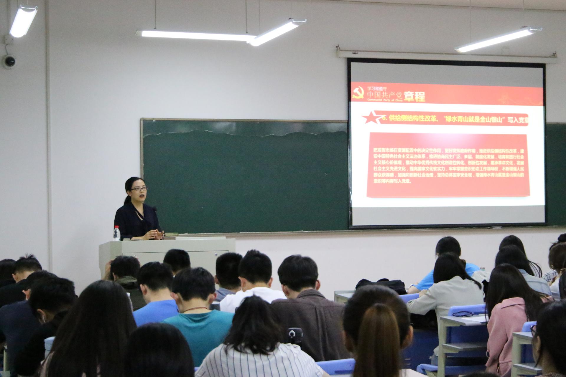 李颂老师的课程从什么是党章,党章的发展史,十九大党修改党章的主要内容以及重要意义四个方面展开。其中,李老师重点分析了党章修改对于固化马克思主义中国化的最新成果和用最新科学理论武装全党的作用。课程最后,李老师对同学们提出了熟记并深入学习社会主义核心价值观的要求。