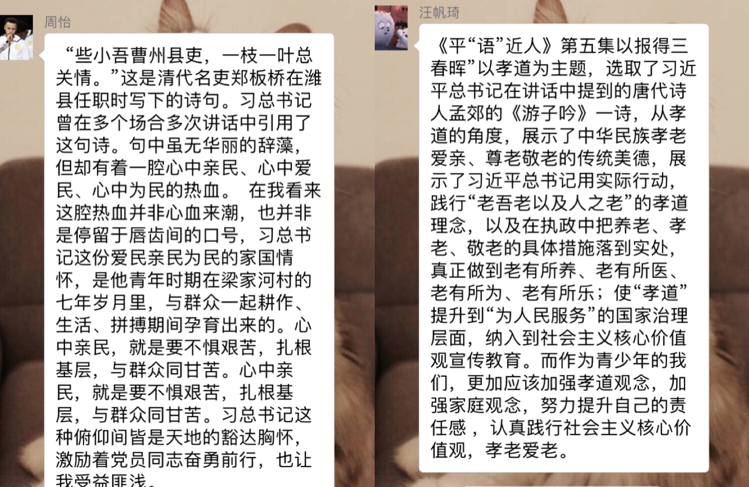 习近平总书记在一系列重要讲话、文章、谈话中引用的古代典籍和经典名句无不包含着深刻的内涵,他善用形象比喻,以传统诗文古语提纲挈领,以常用俗文俚语释疑解惑,化繁为简、生动传神。节目观看完毕后,在支部内部和党员之间形成了学习和讨论的小高潮,大家对于习近平总书记系列重要讲话有了更深刻的理解,对于时代所赋予党员的使命、党员应遵守的底线原则和现阶段自己奋斗的方向有了更明确的认识。