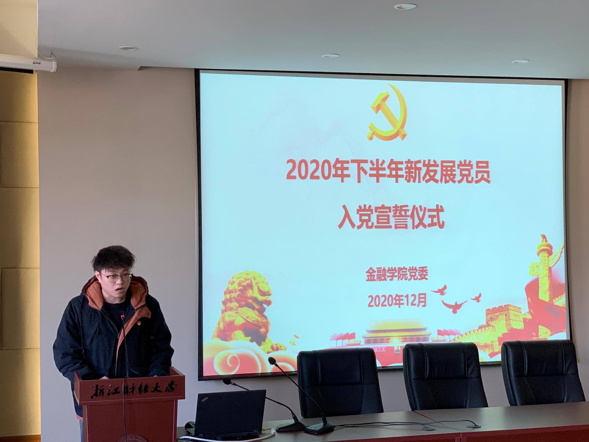 在学院楼202报告厅举行2020年下半年新发展党员入党宣誓仪式。学院党委副书记谢敏、各学生党支部书记及支部委员出席仪式。此次新发展的53名学生党员和1名教师党员参加活动。活动由专职组织员翟丽媛主持。