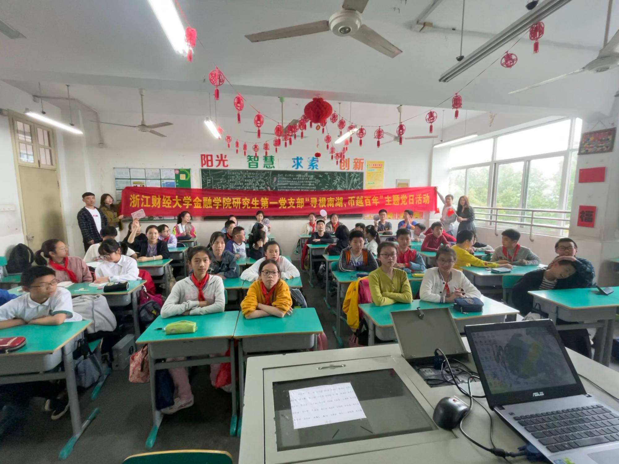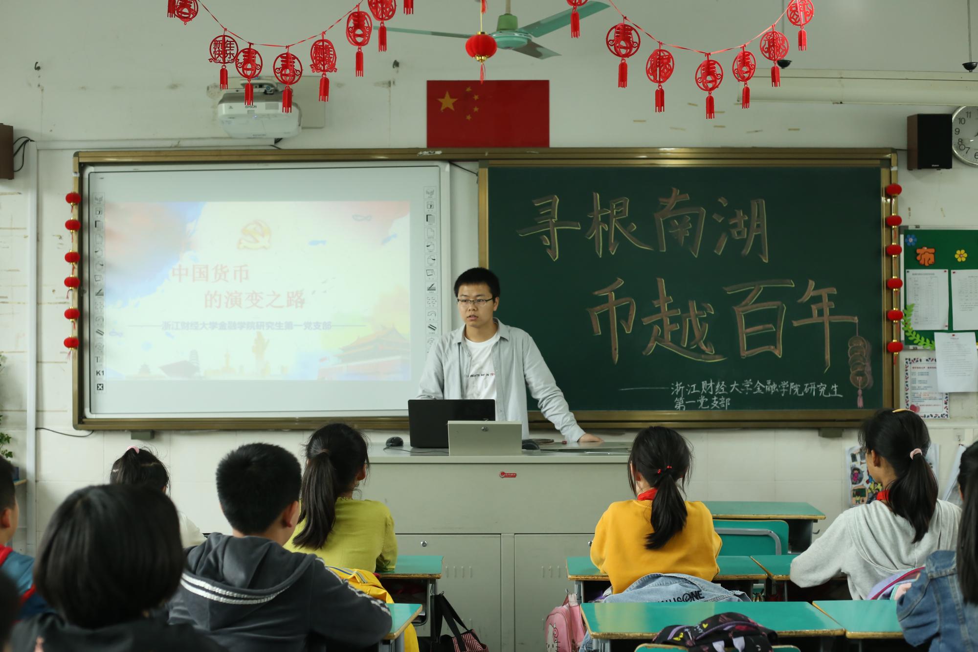作为学院“跟着货币学党史”的系列活动之一,支部党员来到嘉兴市辅成小学,结合自身所学的专业知识,以货币模型、红船模型为教具,为校内六年(5)班的同学们带去了一堂趣味横生的党课。支部组织委员郑月民同志通过讲述建党100年以来的中国货币发展史,尤其是人民币的诞生和演进展现了中国货币体系的变化,从货币角度透视中国的变化,展示了中国共产党立党为公、执政为民、全心全意为人民服务的宗旨和理念。