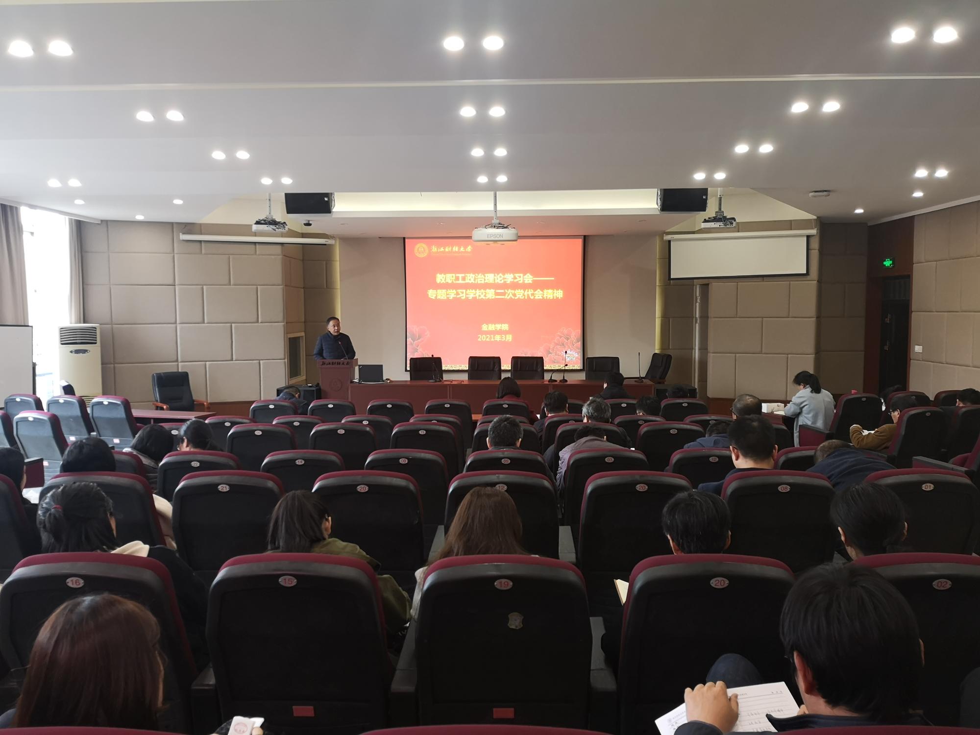 在3-202报告厅召开全院教职工政治理论学习会,专题学习学校第二次党代会精神,以及传达学习学校中层及以上干部会议精神。会议由学院党委书记蔡国金主持。