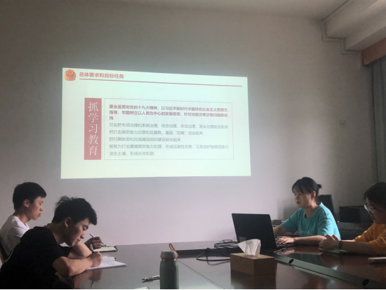 会上,党支部书记陈信老师首先带领全体党员学习传达党委巡视精神。同时,他结合党史学习和工作实际,提出加强党性修养的必要性和重要性。随后,支部党员陈心意以近期热播《扫黑风暴》电视剧为背景,分享学习扫黑除恶这一主题,表达了党中央为弘扬社会正气,坚定扫黑除恶攻坚战必胜的决心,并希望支部党员能从中启迪思想,从中提炼制胜法宝,汲取前进动力和智慧力量。