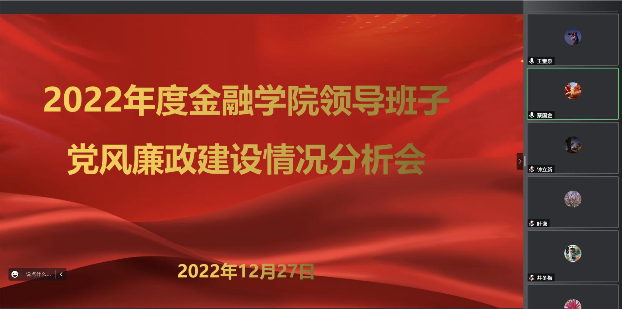 2022年度领导班子党风廉政建设情况分析会在线上举行。校党委委员、副校长王奎泉,学院党政领导班子成员,学院党委委员、纪委委员,系主任、部门主要负责人代表等出席会议。会议由学院党委书记蔡国金主持。