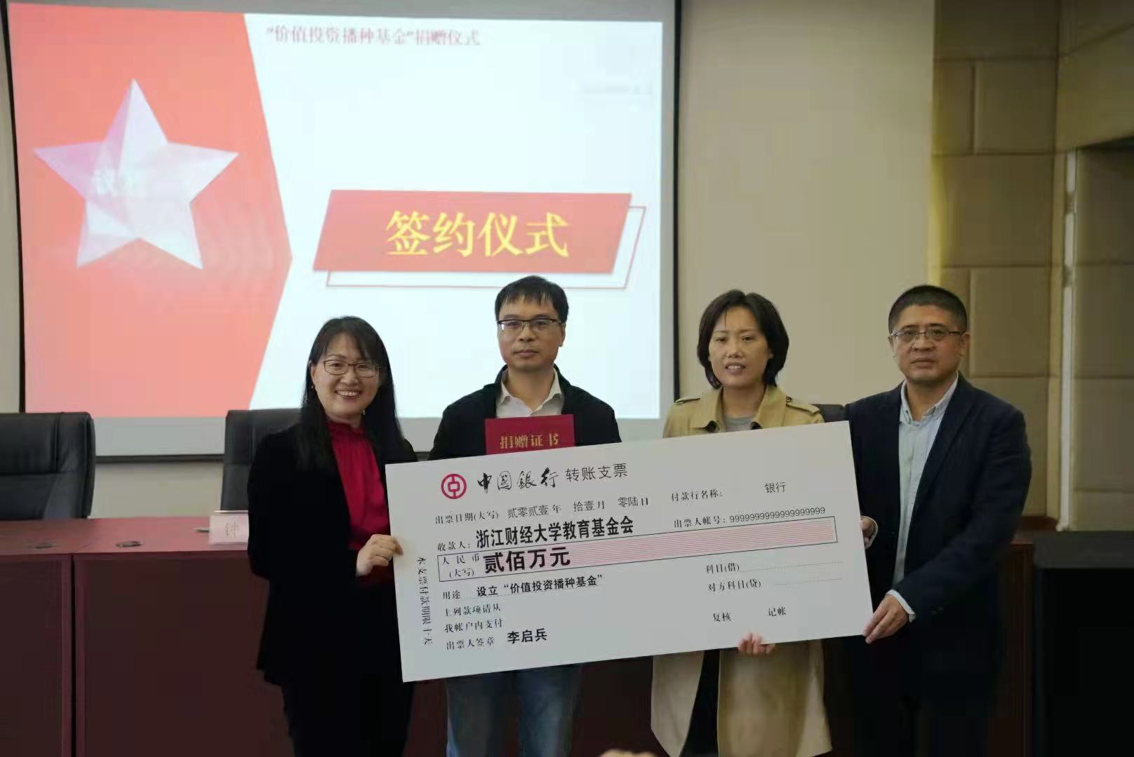 捐赠总额贰佰万元人民币,设立“价值投资播种基金”,用以支持学院专业课程建设、师资队伍建设与人才培养。