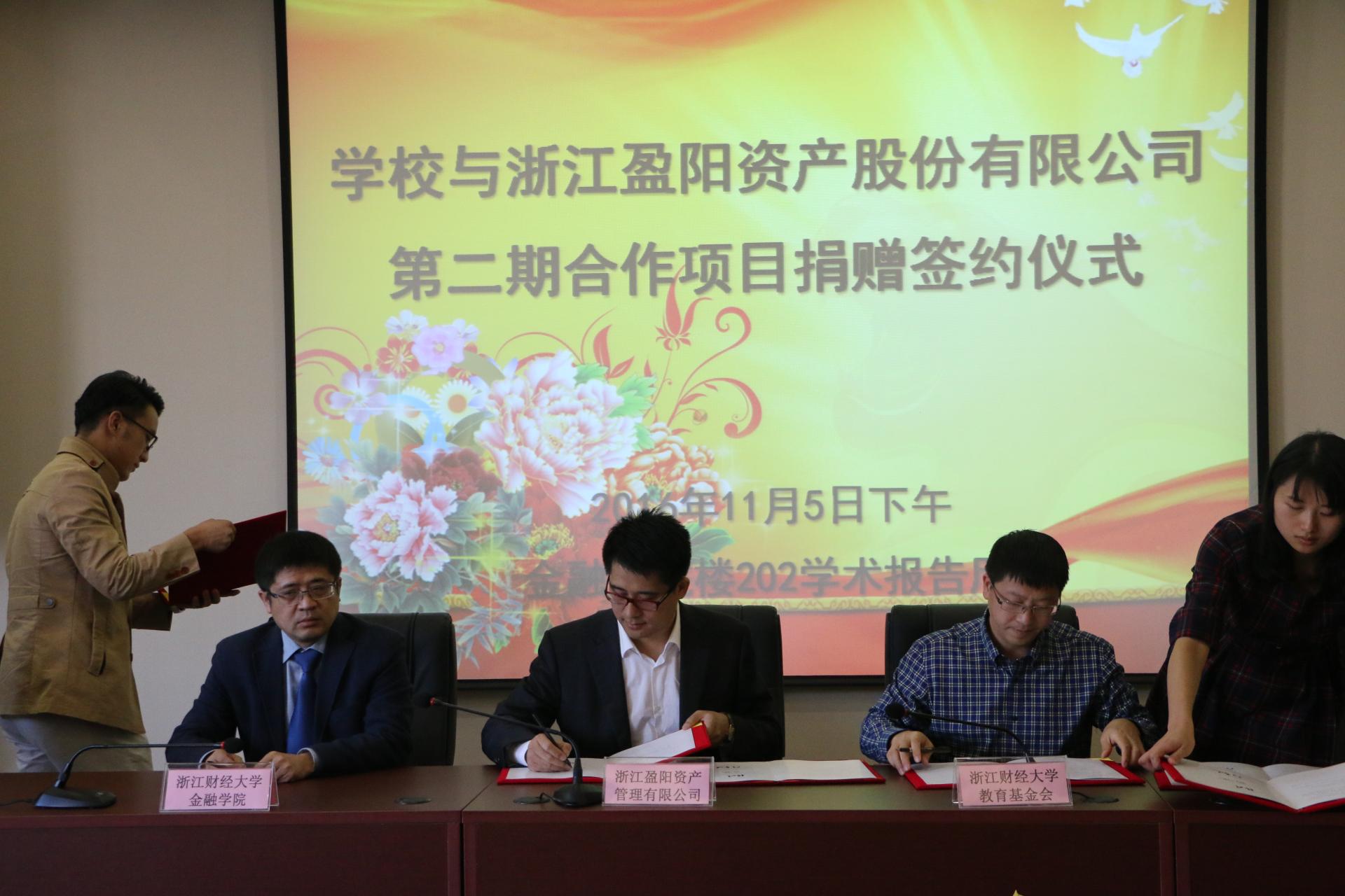 首先进行的是浙江盈阳资产管理股份有限公司第二期合作项目捐赠签约仪式。今年9月,盈阳资产管理股份有限公司与学校签订了校企合作框架协议,捐赠300万元用于合作项目建设。楼栋校友、陈荣达院长、杨健勇副处长共同签署了第二期合作项目捐赠协议书,各位领导、校友嘉宾及在场的师生们共同见证了这一神圣的时刻。