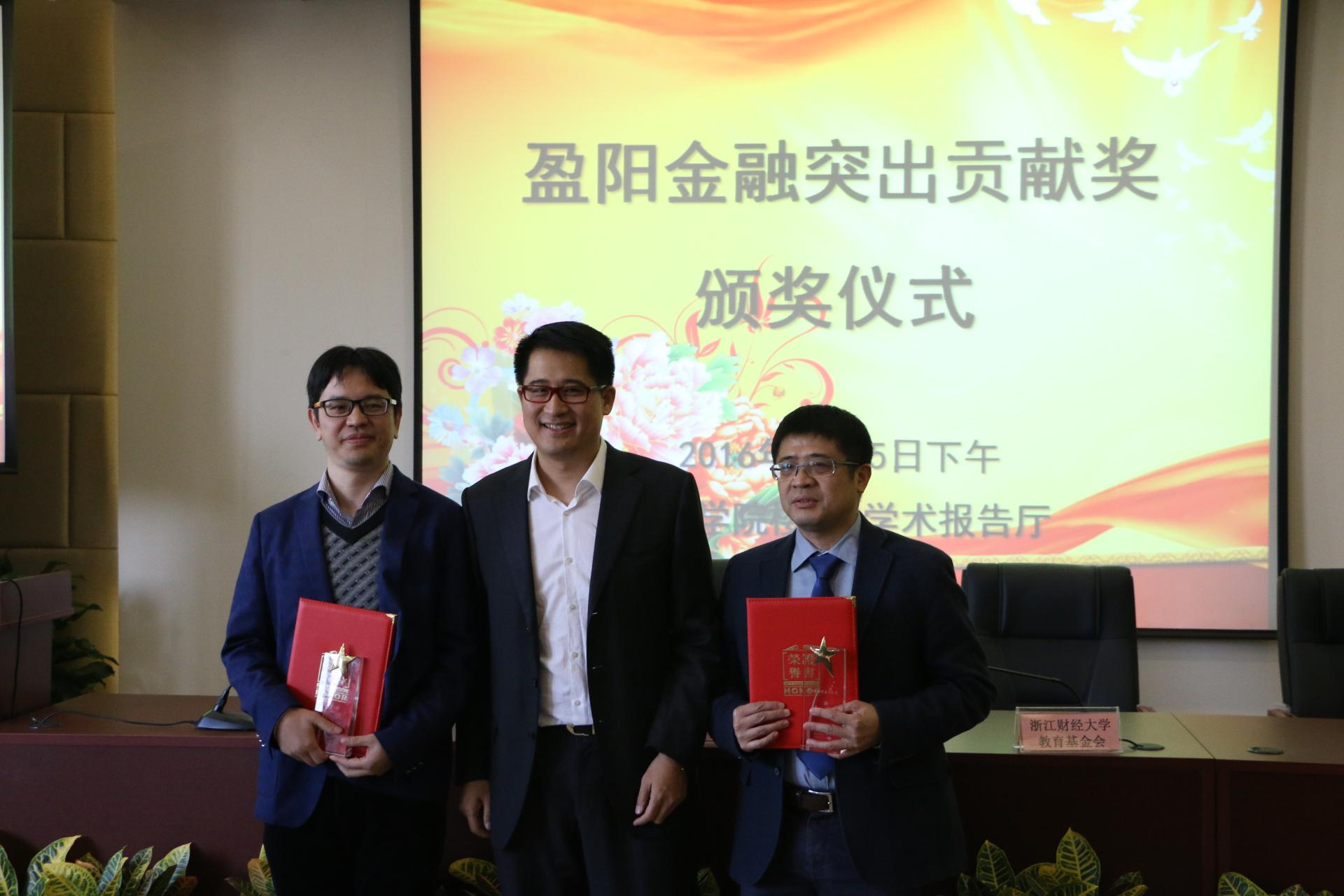 随后举行了盈阳金融突出贡献奖颁奖仪式,陈荣达教授与胡旭阳教授获得盈阳金融突出贡献奖金奖。浙江盈阳资产管理股份有限公司创始人楼栋先生为他们颁奖,并合影留念。最后,胡旭阳教授上台发言,他通过形象生动的语言,结合自己的亲身经历,介绍了黄色仓库
