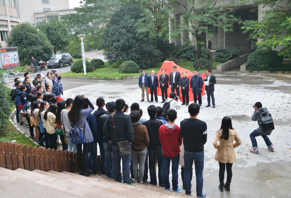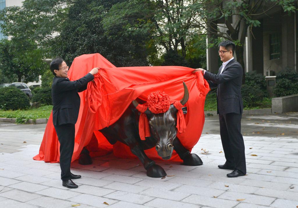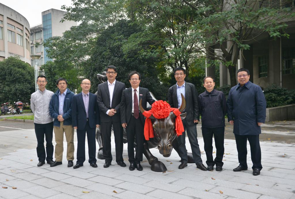 捐赠“盈阳牛”雕像的捐赠仪式在学院门口隆重举行。副校长黄建新、院长李连华、党总支书记杨鹰彪、副书记陈伟、副院长陈荣达、校友办李晓峰等领导及优秀校友楼栋先生出席了此次捐赠仪式,浙江盈阳资产管理股份有限公司部分员工和黄色仓库